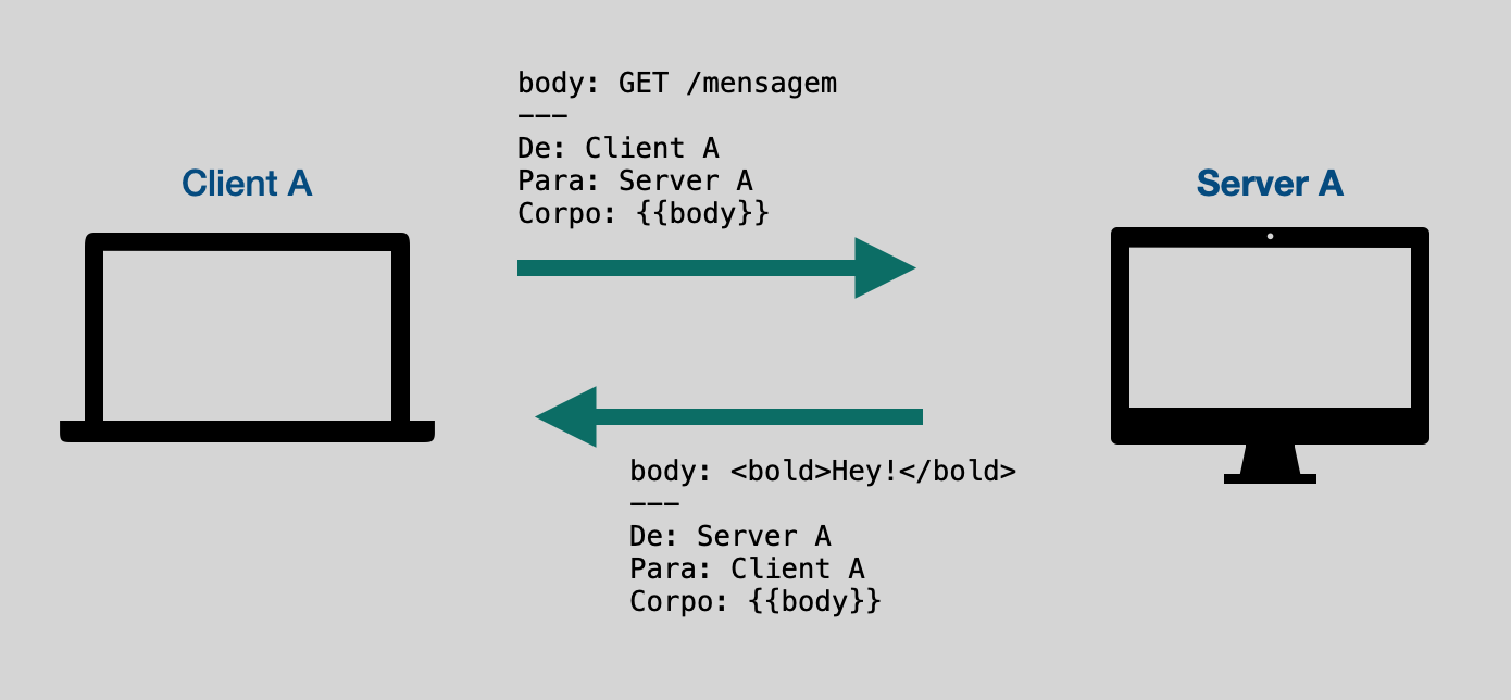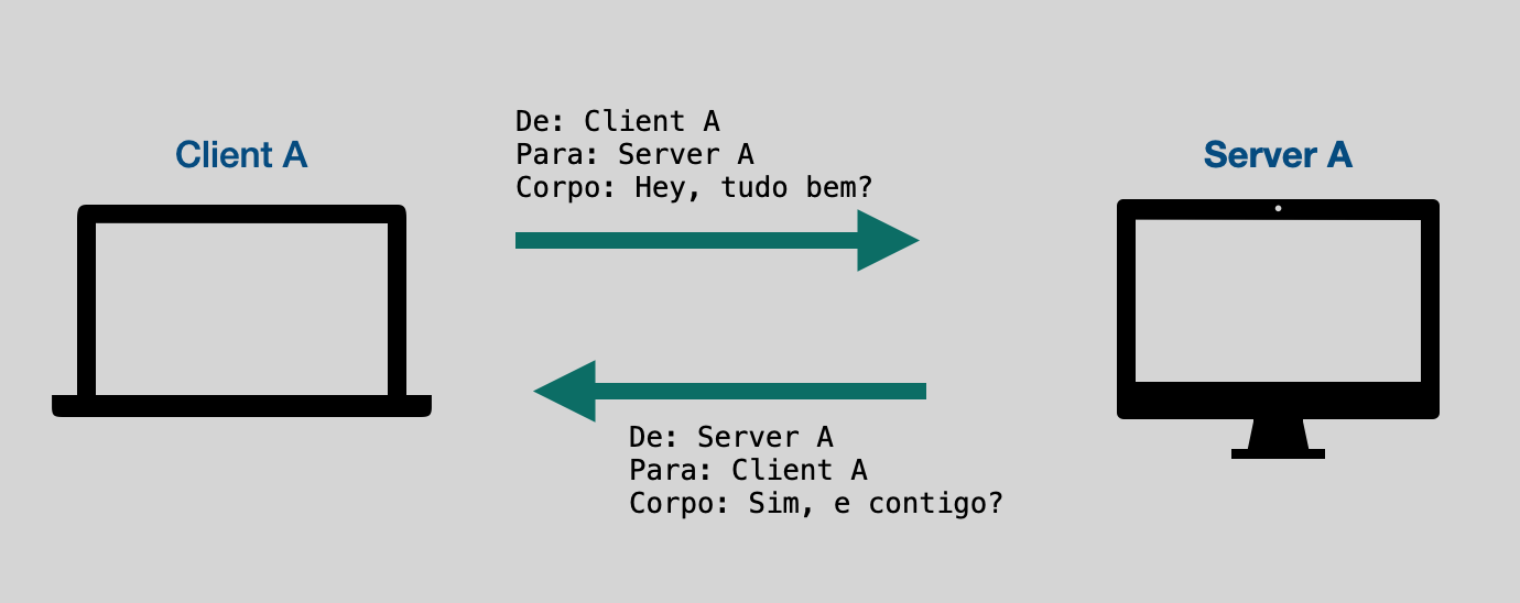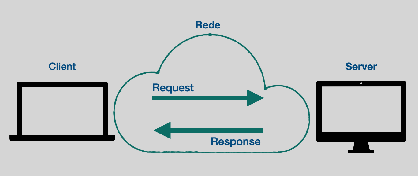 Vamos supor que um determinado computador "A", chamado client, queira enviar uma mensagem a outro computador "B", chamado server. A mensagem que o client envia, também chamada de request, precisa ser transportada através de algum tipo de rede, ou network. O server, por sua vez, pode enviar uma resposta ao client, chamada de response.